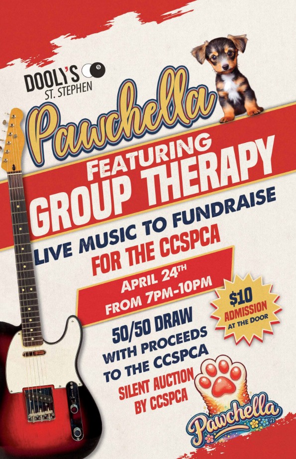 Join us for a night of live rock n’ roll music and dance with Group Therapy at Dooly’s in St Stephen on April 24, 2026! It’s from 7:00 pm – 10:00 pm. There will be a 50/50 draw and a silent auction.