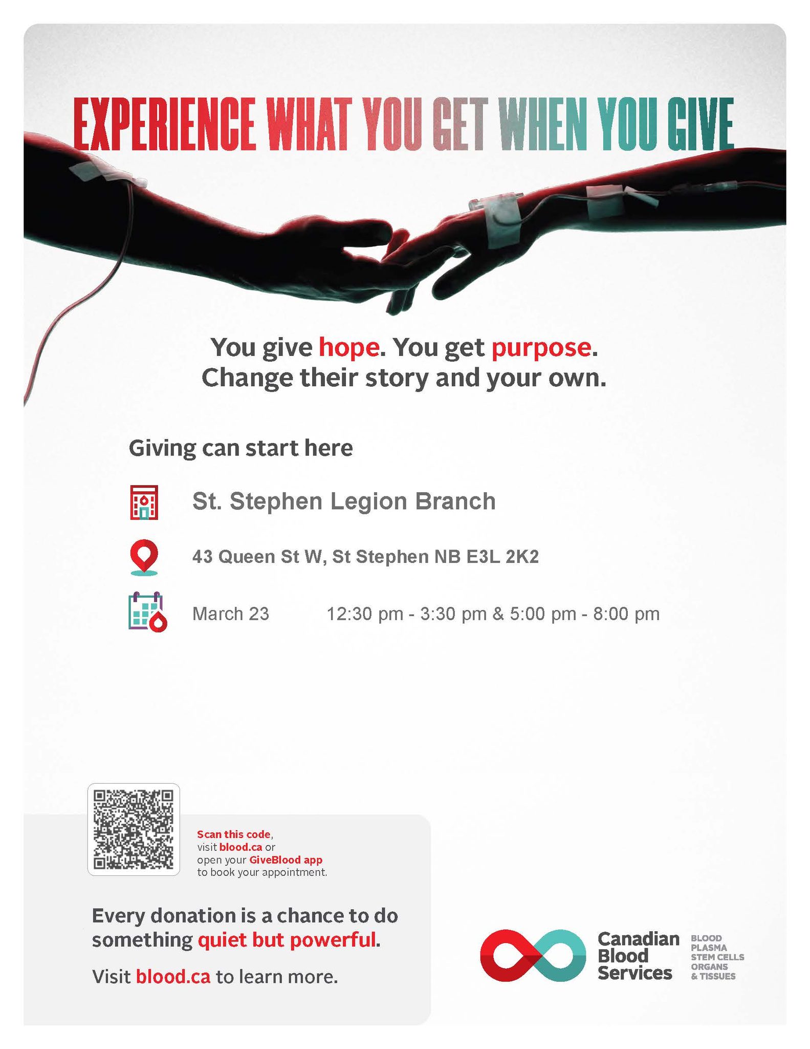 A blood donor clinic will be held at the Royal Canadian Legion in St. Stephen on Monday, March 23rd. Give the gift of life - give blood.