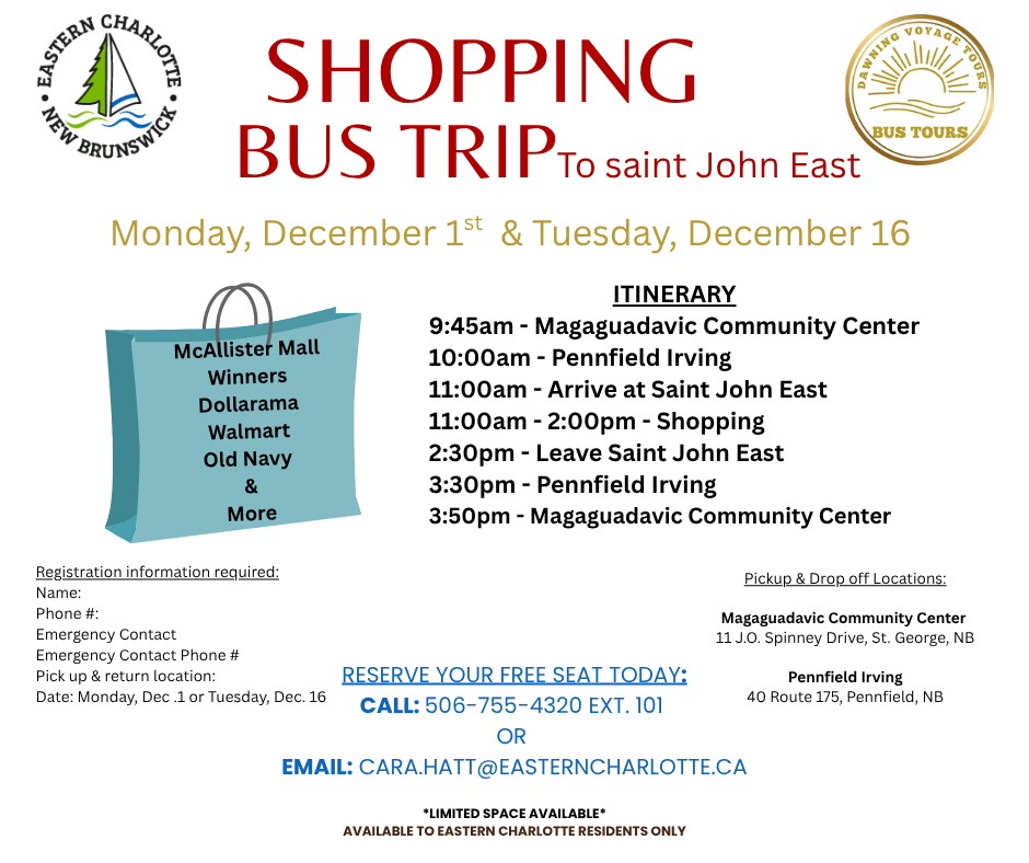 Dawning ToursEastern Charlotte Residents are invited to reserve a seat for one of two bus trips to Saint John East.