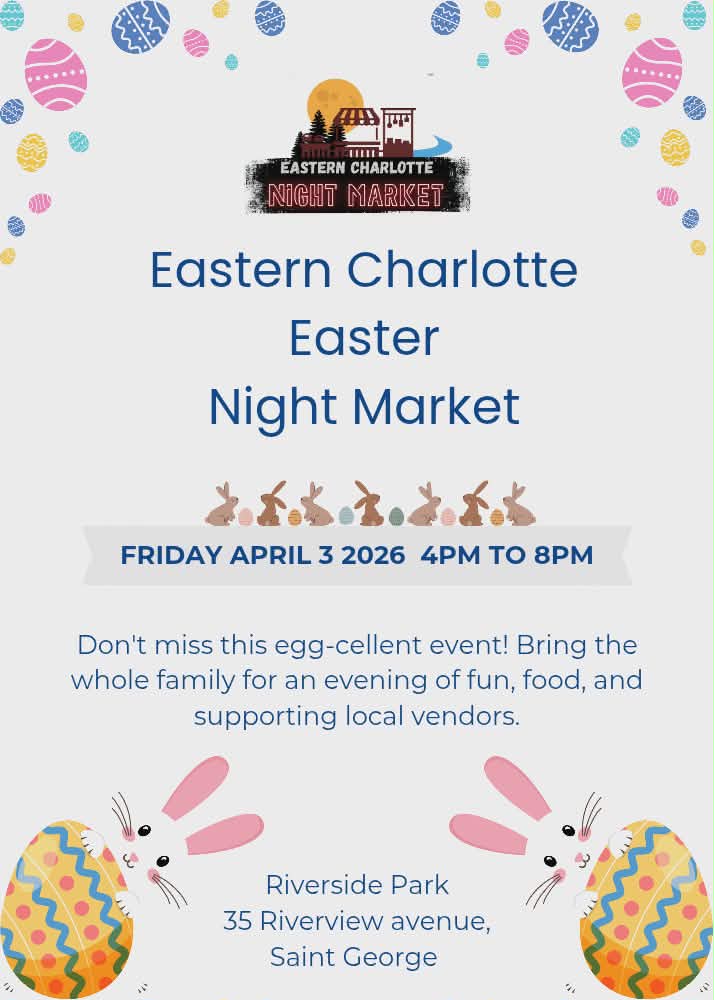 Riverside Park 35 Riverside Ave., St. George, NBHOP HOP HOP!!! Here comes the Easter Bunny. Join us for a fun evening at the Eastern Charlotte Night Market on April 3 from 4pm to 8pm. Enjoy food from our two popular hot food stands plus a new addition selling Brazilian street food while you explore the market. We have a great line up […]